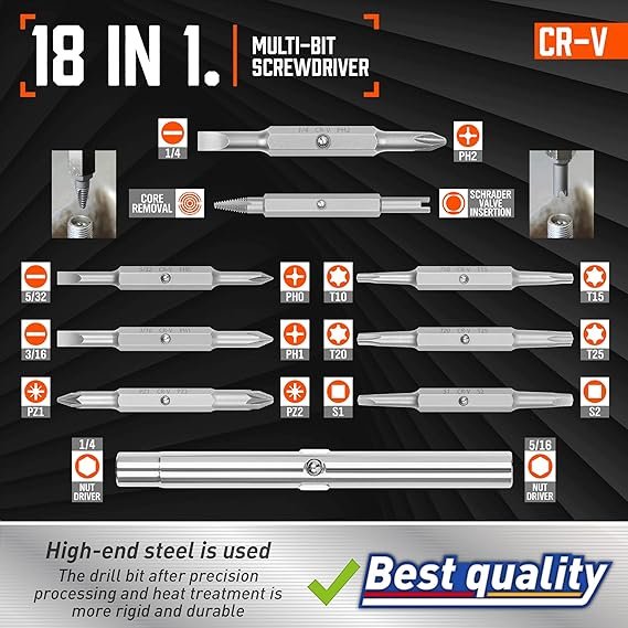 - [Easy to carry]: Interchangeable blade for fast and easy switch out, suitable for home, car repair, outdoor and other working places, without additional screwdriver, a set of 18 in 1 screwdriver to solve all your problems.