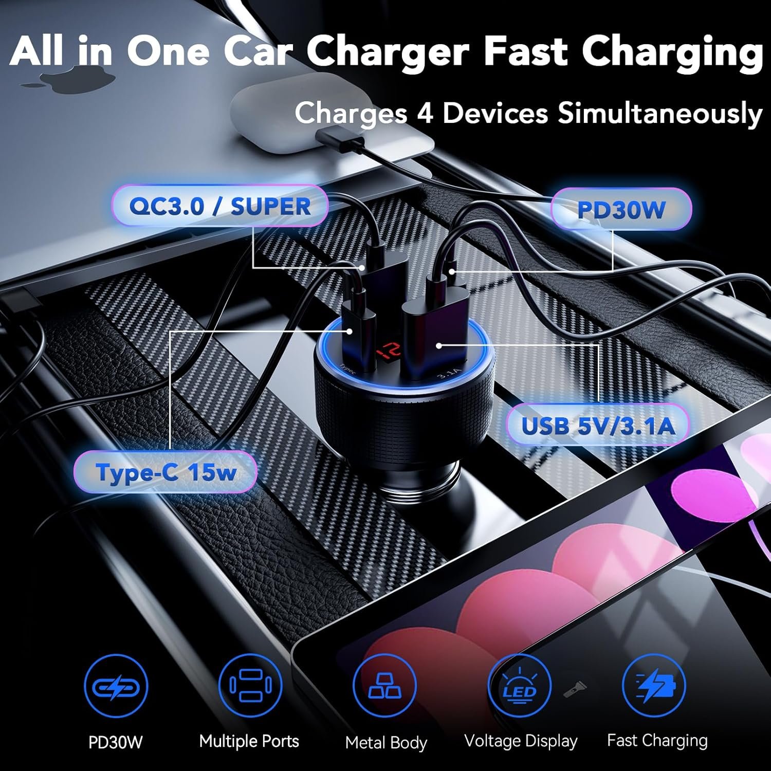 - 4 PORT CAR CHARGER : Car charger adapter design with four usb ports, supporting PD 30W and super high output, can fast charge all prevailing phones, tablets and other usb devices, which can charge 4 phones or tablets at the same time. And this cigarette lighter USB charger supports PPS/PD3.0/QC3.0/AFC and FCP super fast charging protocols